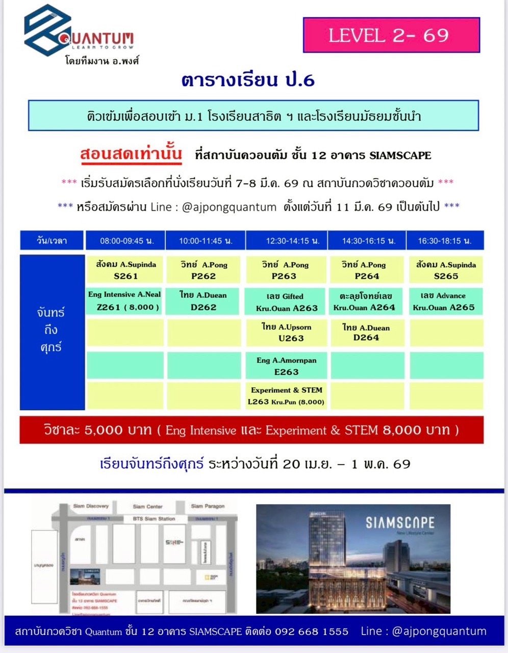 ติวสอบเข้า ม.1 โรงเรียนสาธิต ฯ และโครงการพิเศษโรงเรียนรัฐบาลชั้นนำ ติดต่อเพื่อสมัครได้ที่ 092 668 1555 หรือ Line@ajpongquantum