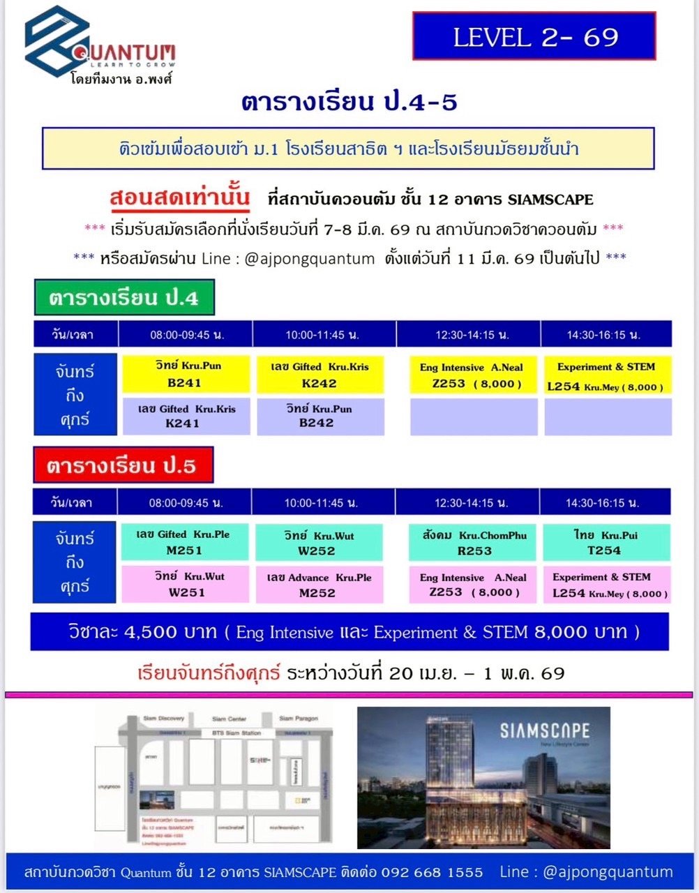 ติวสอบเข้า ม.1 โรงเรียนสาธิต ฯ และโครงการพิเศษโรงเรียนรัฐบาลชั้นนำ ติดต่อเพื่อสมัครได้ที่ 092 668 1555 หรือ Line@ajpongquantum