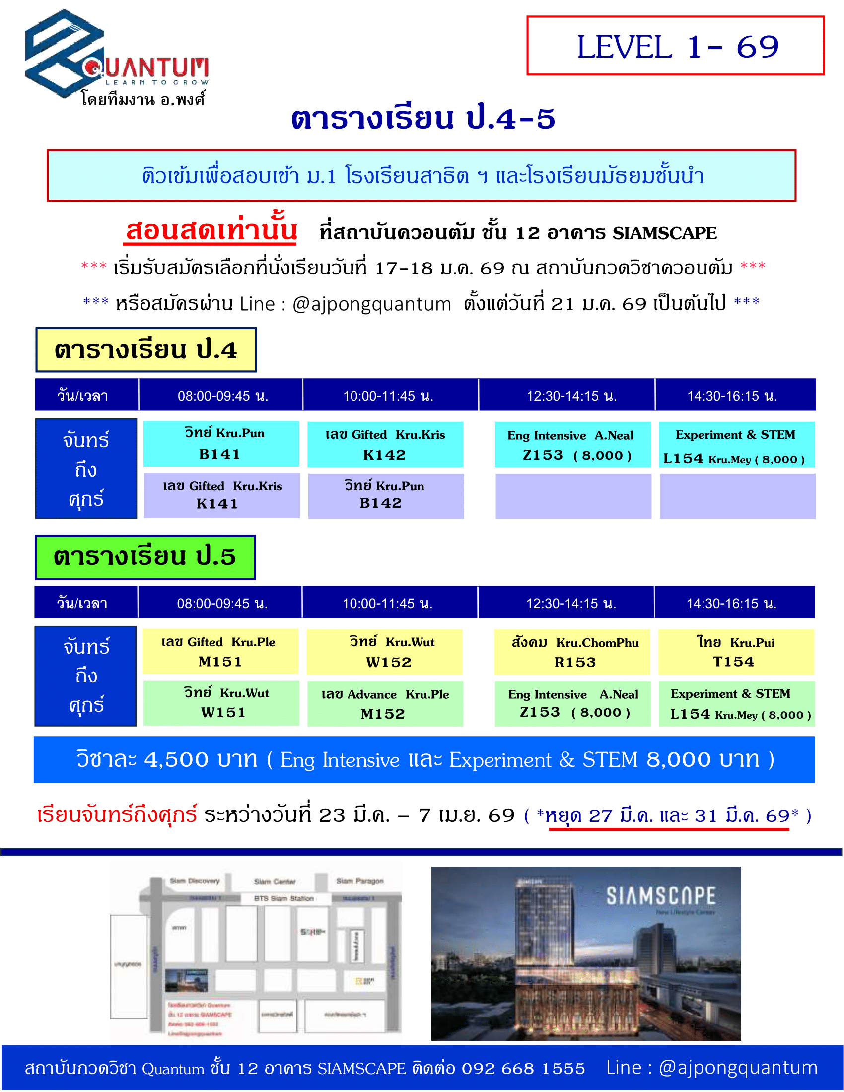 ตารางเรียน ป.4-5 LEVEL 1 ปี 69
